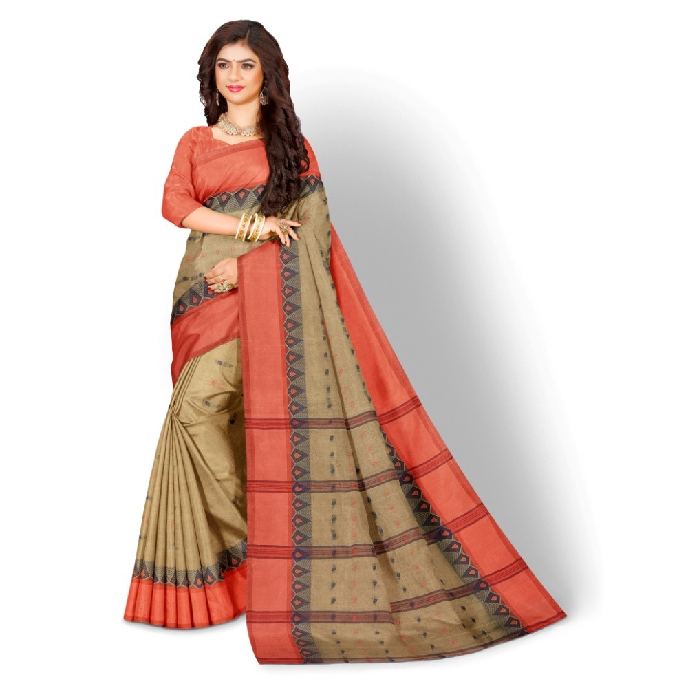 Beige 100% Cotton Tant Saree with Orange Border (Handwoven Work)