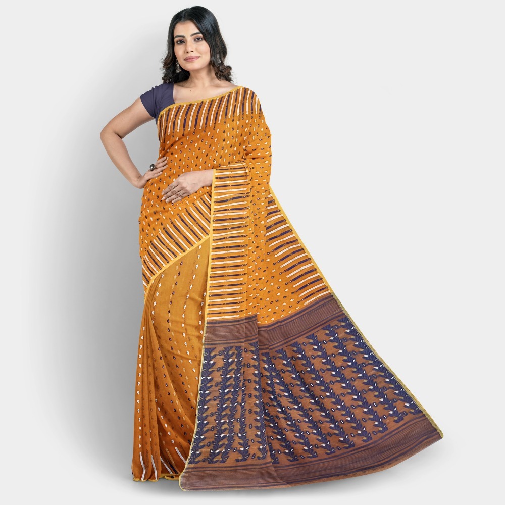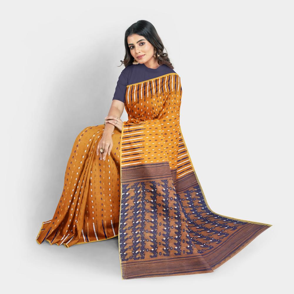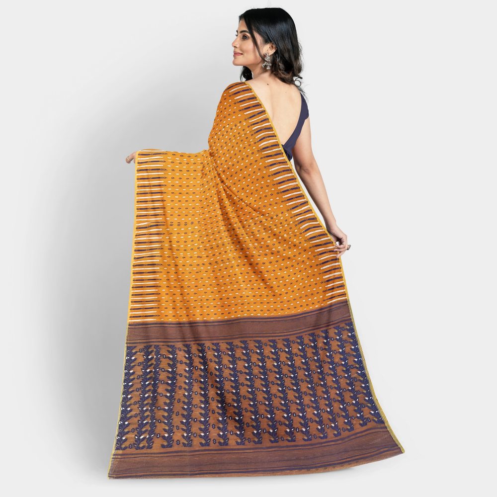 This mustard yellow cotton silk Jamdani saree is perfect for women who want a traditional touch without the heaviness of classic Jamdani designs.
