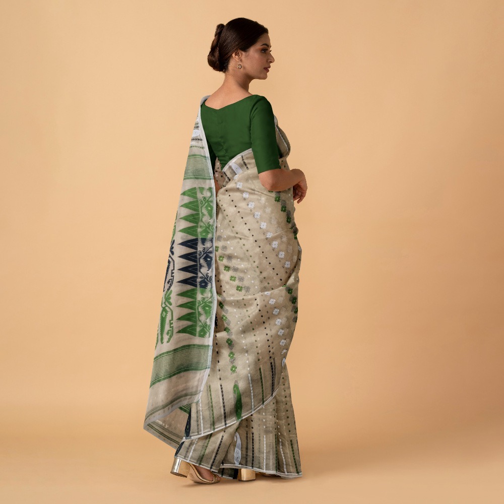 Explore this collection of beautifully designed All Over Work Off White Soft Jamdani sarees online from Mayabi. These elegantly crafted Silk Dhakai Jamdani sarees will surely add to your wardrobe. The master weavers from the finest cotton yarn weave these Dhakai Jamdani sarees, using fine raw silk in the warp and weft for the body. We make the Par or the edge of this Off White Dhakai Jamdani saree with exquisite cotton threads.