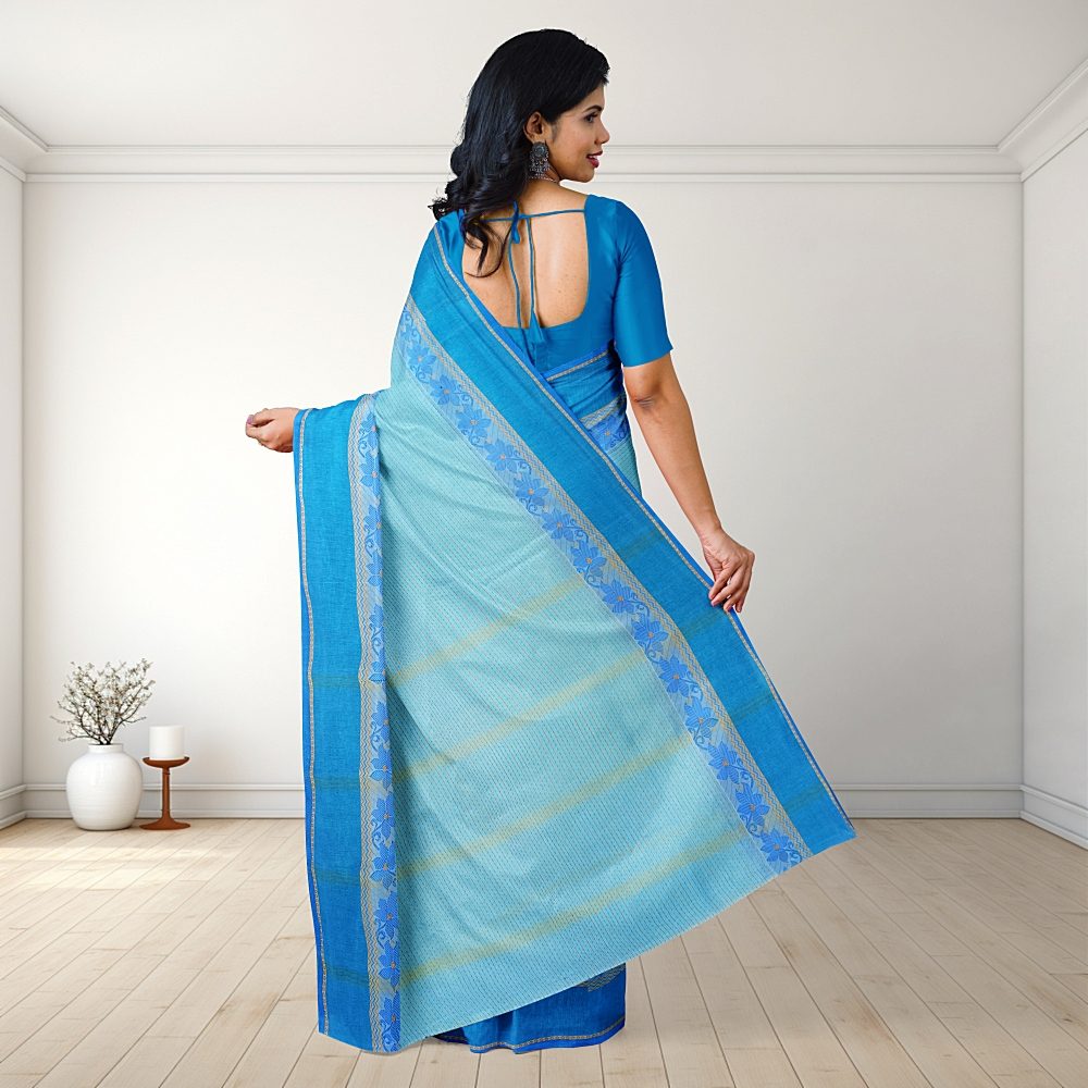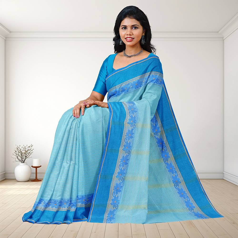 Sky Blue Summer Pure Cotton Bengali Tant Saree