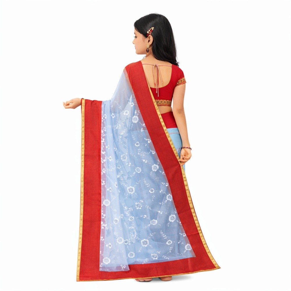 Crafted from soft net, allowing easy movement and all-day comfort for active little girls. The saree showcases a bright white base with a striking red border, decorated with playful Bengali embroidery work on the anchal that adds a unique cultural touch without feeling heavy or uncomfortable.