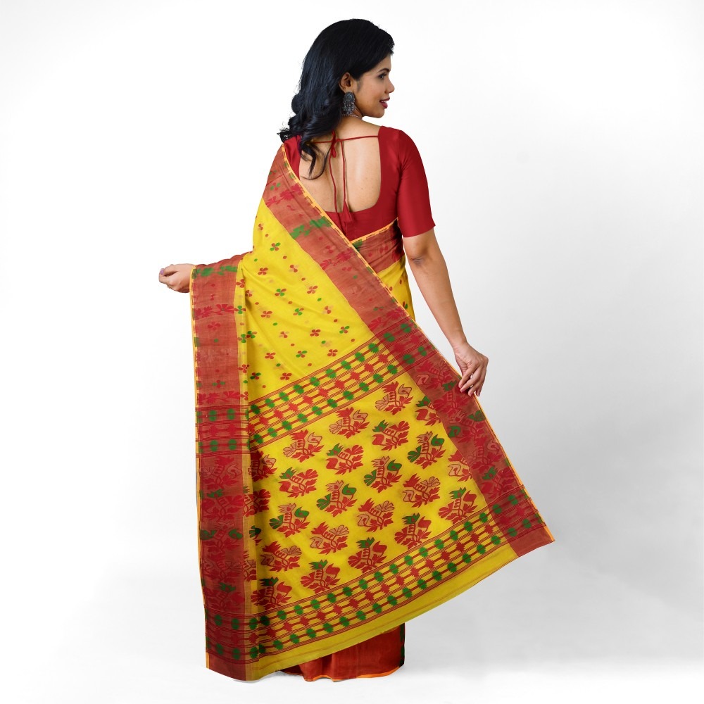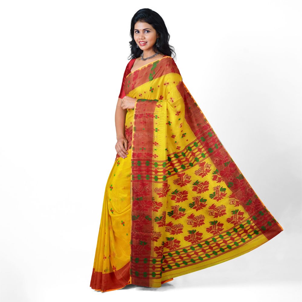 This handwoven Baluchari saree is crafted from 100% pure cotton, making it lightweight, breathable, and perfect for long summer wear. The vibrant yellow base with rich red border creates a classic Bengali festive look.