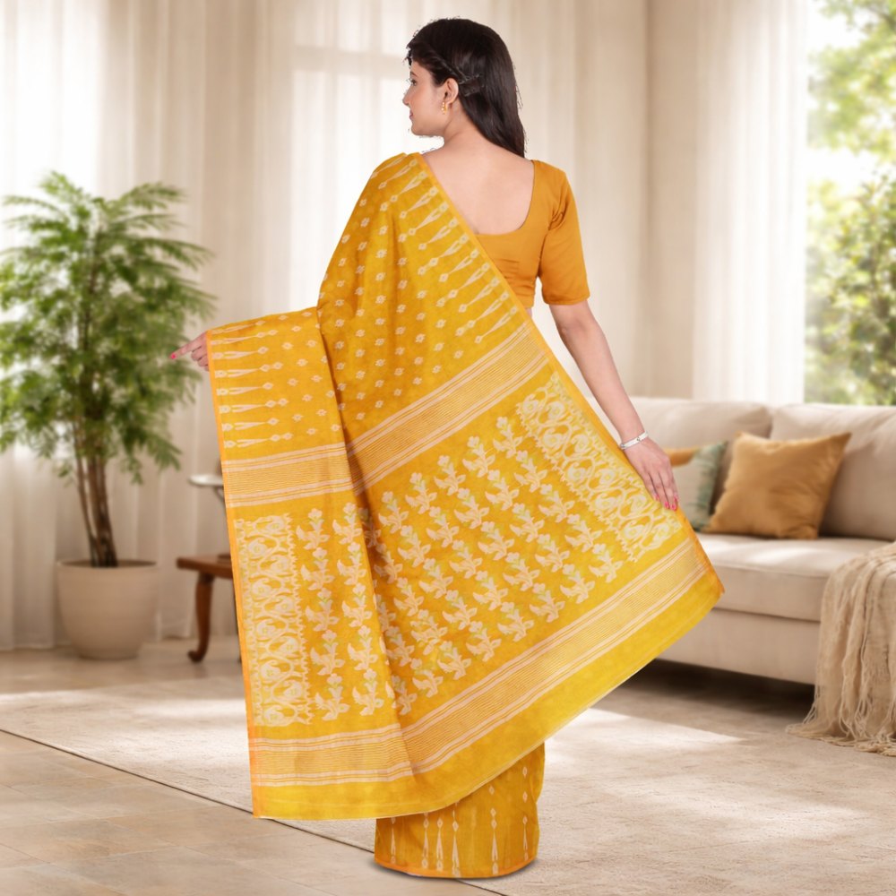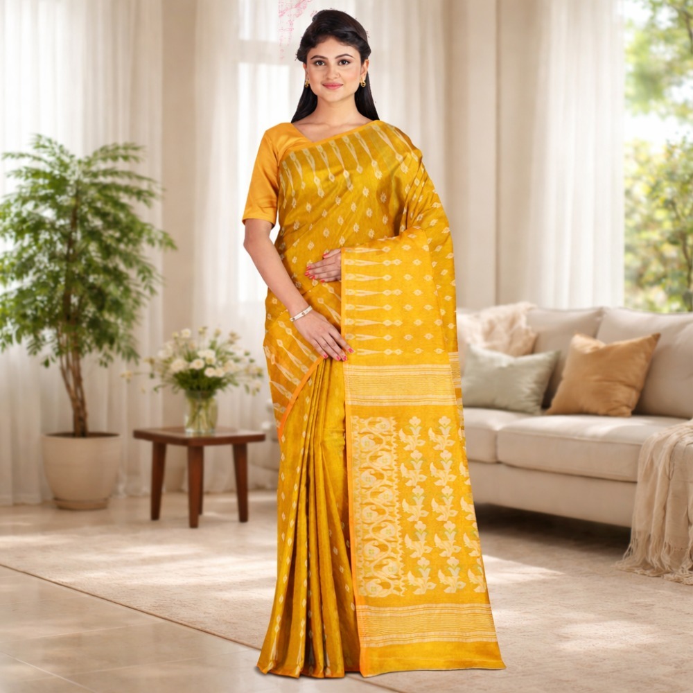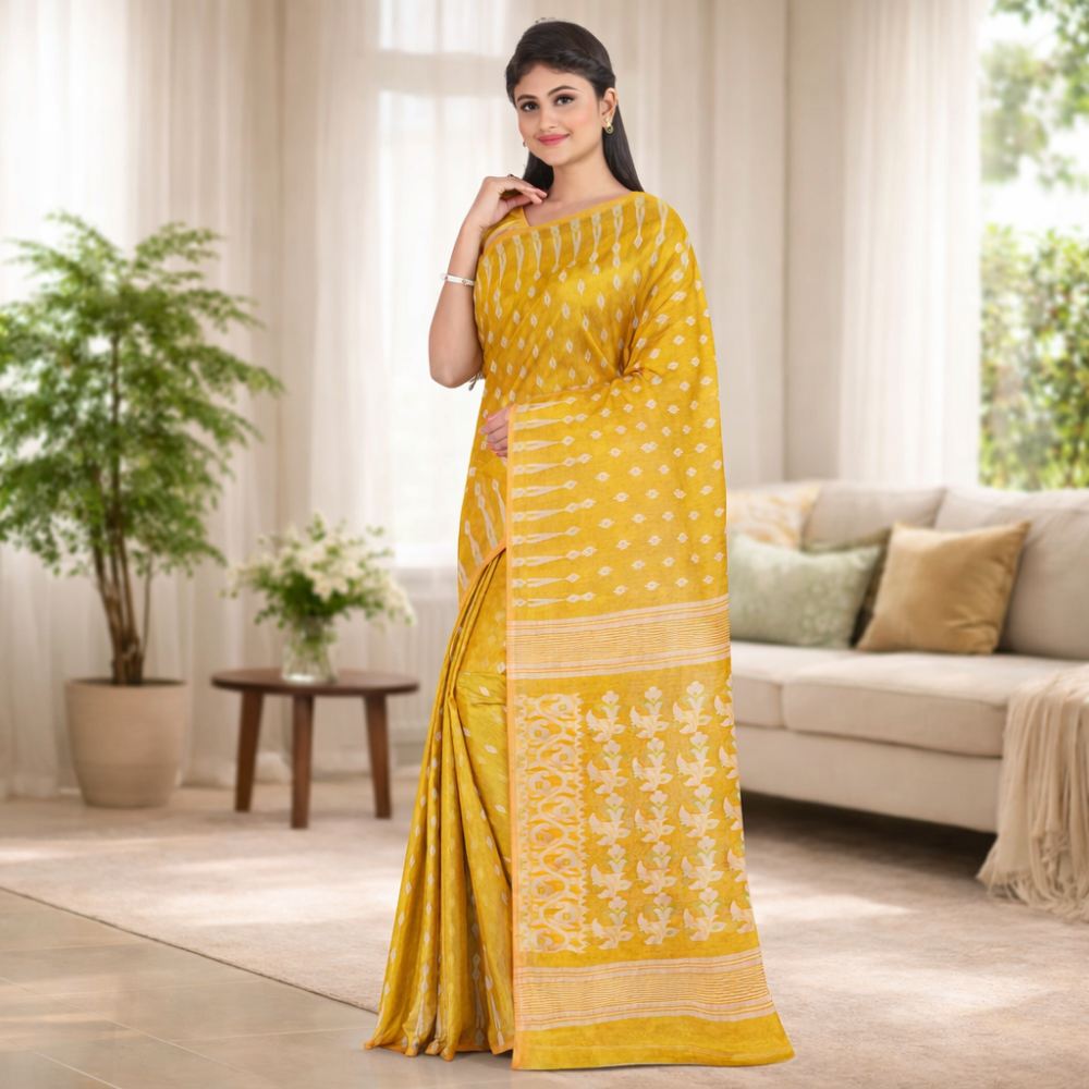 Yellow Dhakai Jamdani Saree – Lightweight Cotton Silk for Haldi, Puja & Daily Elegance