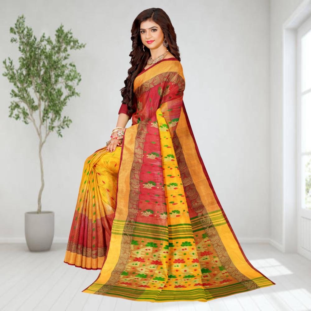 Yellow Bengal Tant Tussar Cotton Tant Banarasi Saree with Red Border in premium Golden Zari Border.